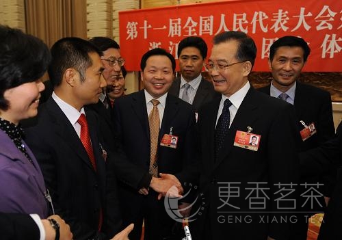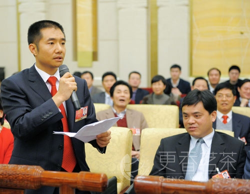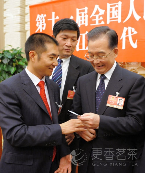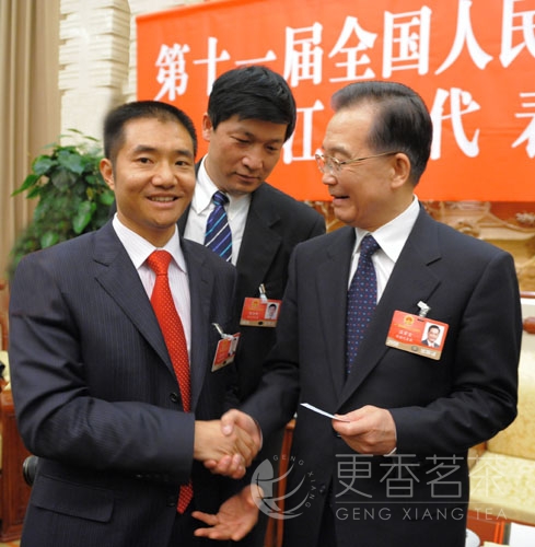 会议最后,全国人大代表、浙江更香有机茶业开发有限公司董事长俞学文现场举手发言,向总理说:“我是来自基层的农民代表,想发言5分钟”。在总理获准后,俞学文代表介绍了在总理惠农的大好政策以及浙江省委、省政府实施“创业富民、创新强省”和以发展高效、生态的现代农业为主要内容的指导方针下,浙江农村农民生活发生了翻天覆地的变化,自己创办的更香茶叶公司也在大好的形势下,抓住机遇,短短几年时间成功走出了一条“有机茶绿色产业链”,形成了“农户+合作社+基地+加工厂+科研+市场+品牌”的发展模式。成长为农业产业化国家级龙头企业。