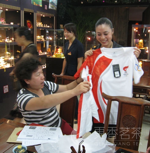 7月30日,北京市私营个体协会办公室主任史国兰(左)带着欣喜来到更香公司,她的手中拿着一件让更香公司总经理朱丽俐以及所有更香人都倍感兴奋的礼物——奥运火炬手制服。
