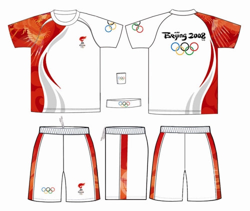 火炬手制服正面左上方是北京奥运会火炬接力“火凤凰”的标志,背面绘有奥运五环标志和“北京2008”的字样。服装为插肩款式,肩部不对称绘制传统凤纹图案,流线型设计动感强烈,形成火凤凰振翅欲飞的印象。凤为百鸟之王,在五行中属火,是高贵美好的象征。中国传统文化中凤凰涅磐、浴火重生的传说影响深远。北京奥运会火炬手将身着有凤来仪、祥云缭绕的制服,高举奥运圣火,手手相传地将祥瑞和平带到世界各地。