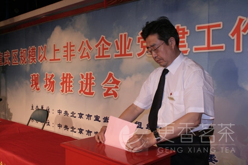 其中,第一环节即为现场观摩更香公司党支部成立大会。首先由广外街道工委书记缪剑虹宣读批准成立更香公司党支部的批复,现场观摩北京更香茶叶有限责任公司党员大会选举支部委员;成立大会之后,由市委组织部组织二处处长王兴聘、区委常委、组织部部长赵林华、区长助理申京云、向更香公司党支部赠送党员电教设备和音像资料。