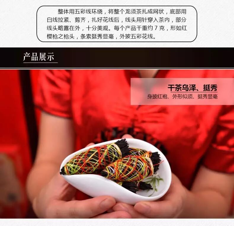龙须茶的一大特点就是扎花,茶叶成型后,在其底部扎上白线,茶身用白、绿、黄、蓝、红五彩丝线扎成网状。制作时的“五花大绑”,像是披上了一层五彩外衣,待到要冲泡解绑时,犹如佳人“宽衣解带”。对于第一次解绑龙须茶的茶友们,可能会无从下手,直接用剪子剪开。其实解龙须茶的外衣很简单,只要找到茶叶底部的线头,从外到里依序轻轻拆解便可以了。从外到里,一件件去衣,顺序是红--> 绿--->黄--->白。最后,将底部的白色衣带留住,方便冲泡后欣赏龙须茶的美姿。