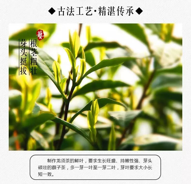 龙须茶十分讲究选料,经过精细的制作过程,风格独特,是值得品饮的优质茶品。其采用一芽一叶或一芽二叶且芽头壮硕的芽叶为主,精选芽叶大小、长短基本一致的鲜叶,经萎凋、揉捻、发酵、过红锅、扎把、干燥、扎花等工序制作而成。